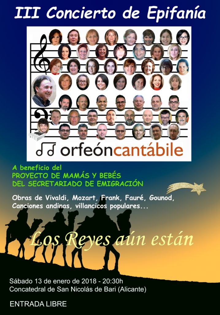 Os invitamos al entrañable Concierto Benefico de Epifanía a cargo de Orfeón Cantábile de Alicante que se celebrará este próximo miércoles en la Concatedral. A la entrada al templo , junto con el programa, se entregará a los asistentes un sobre para que , los que lo desen, puedan colaborar con el proyecto “Grupos de mamás y bebes”.
