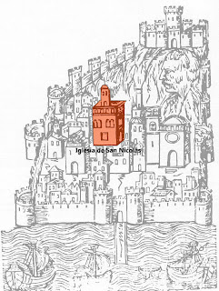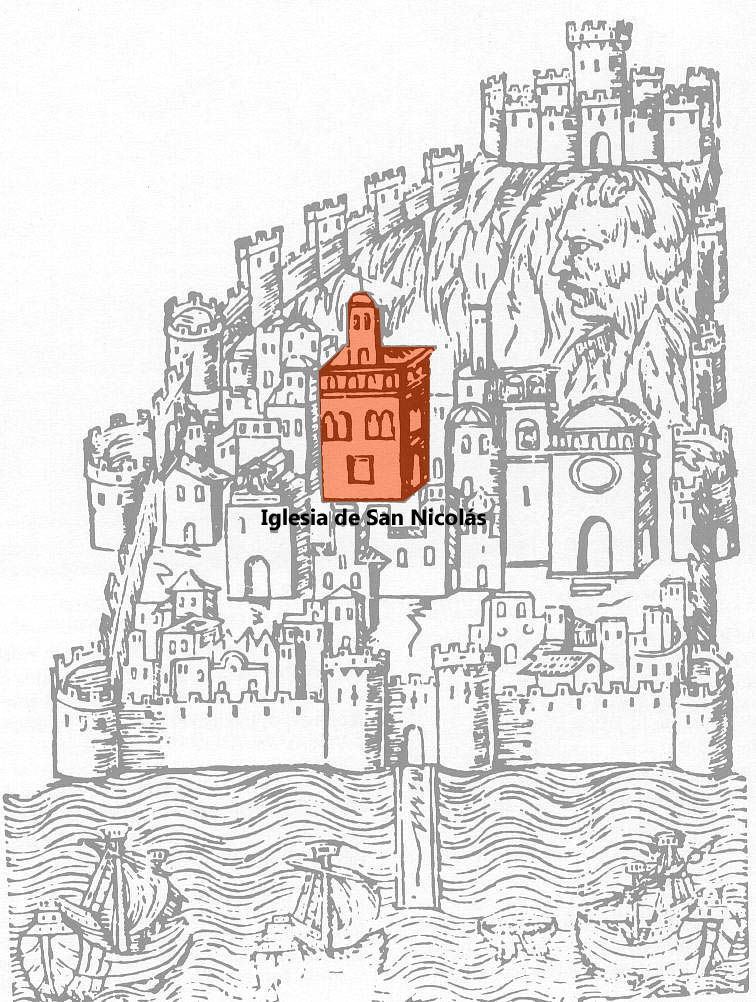 | Xilografía de Martín de Viciana en el que he destacado la Iglesia de San Nicolás. |